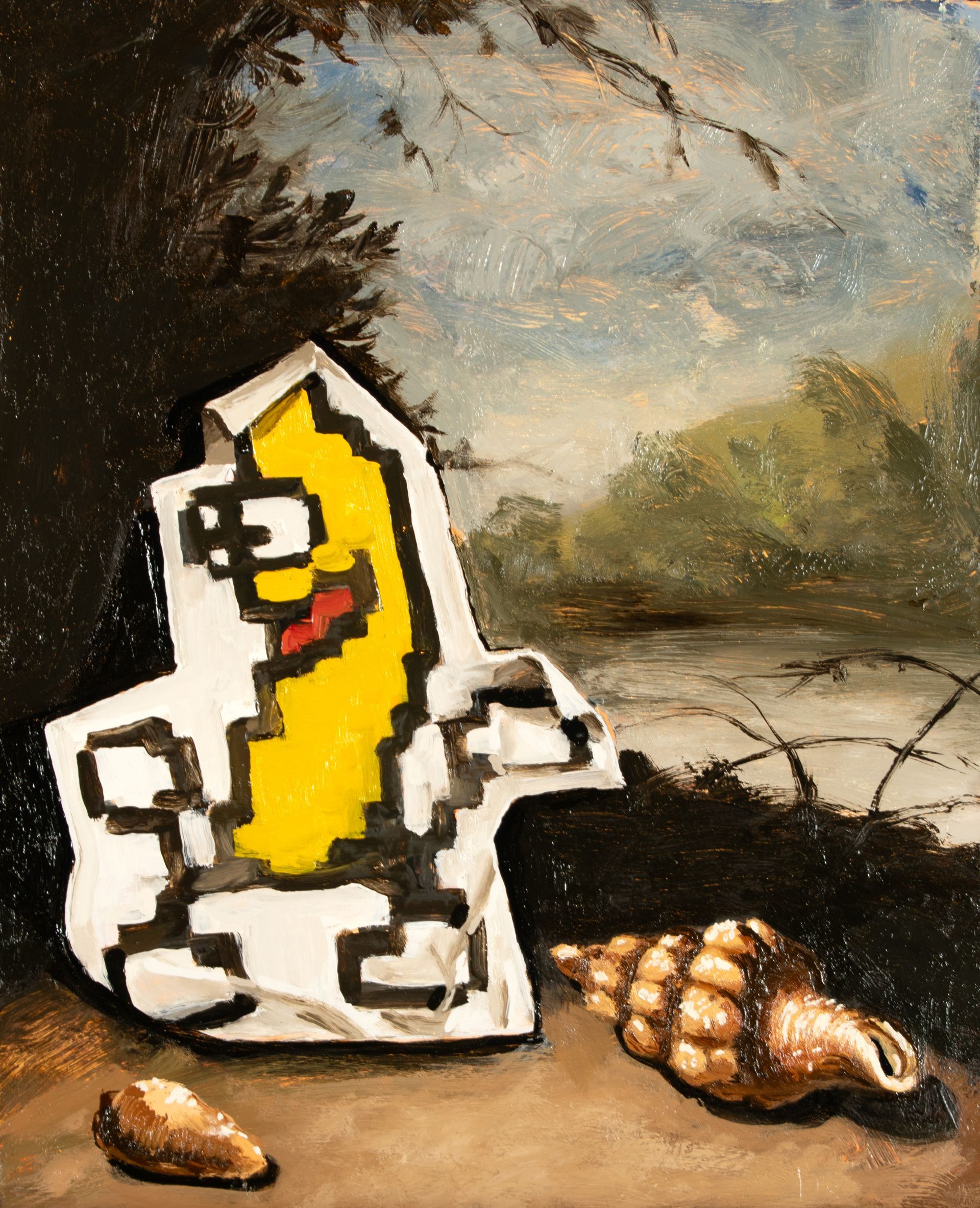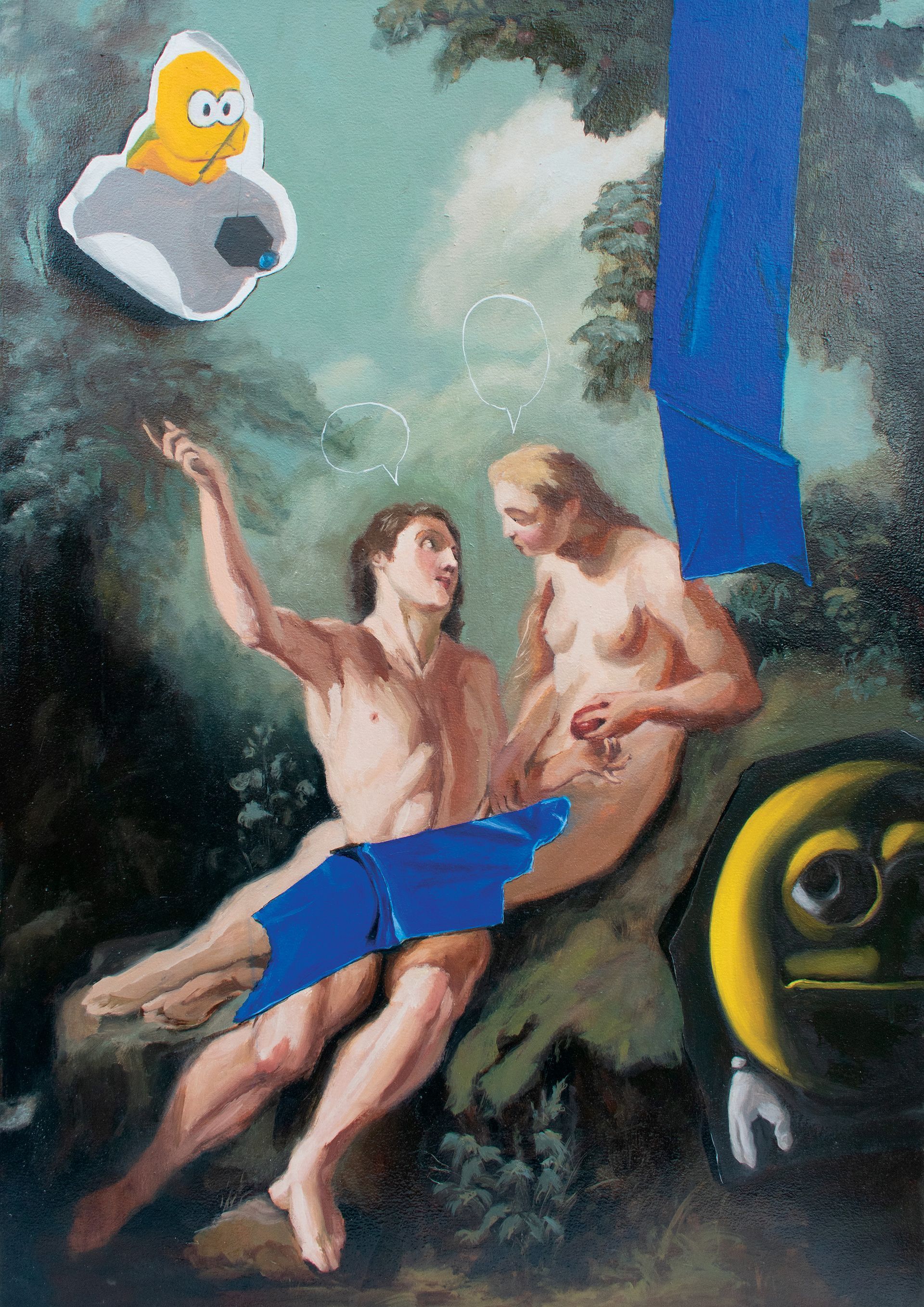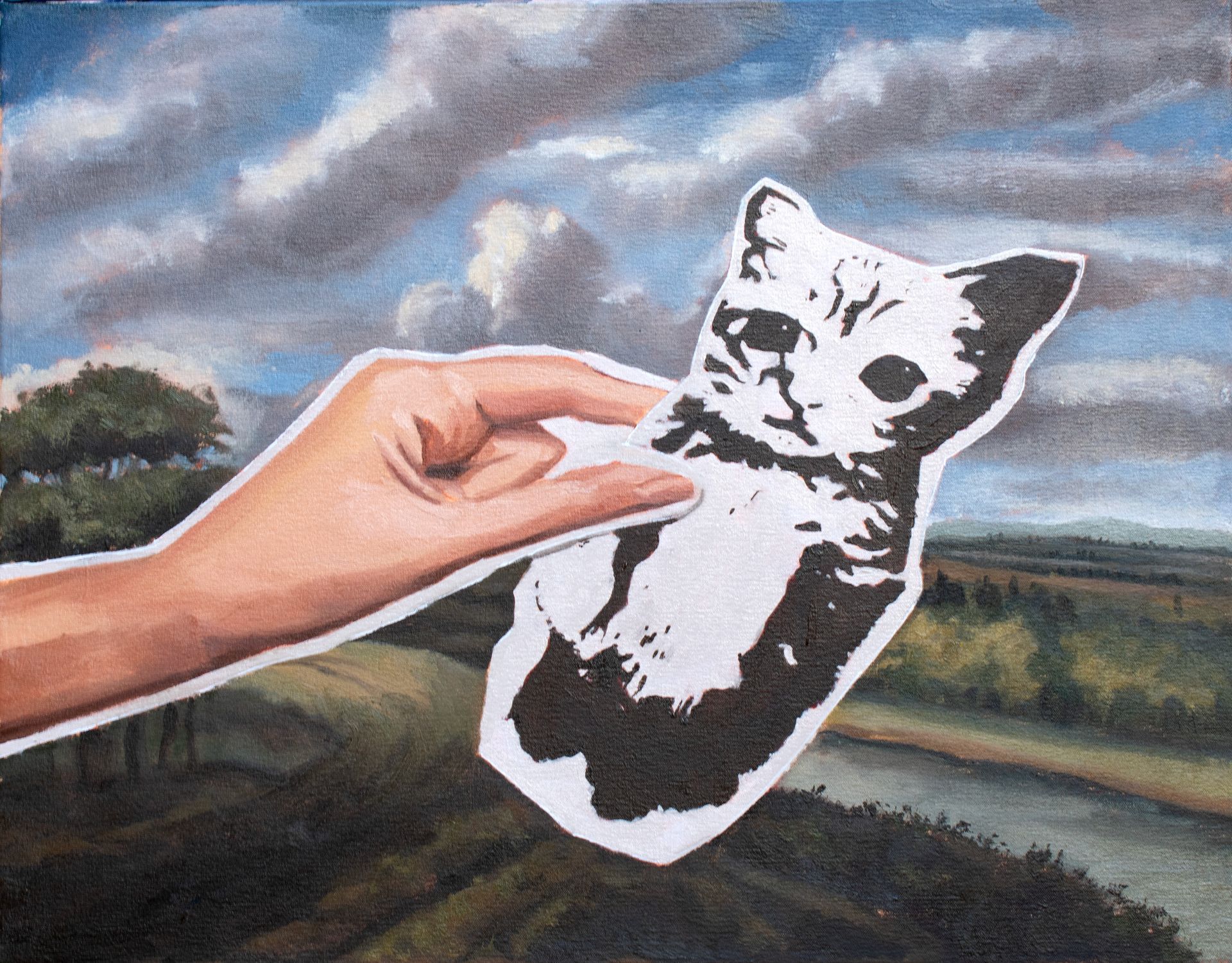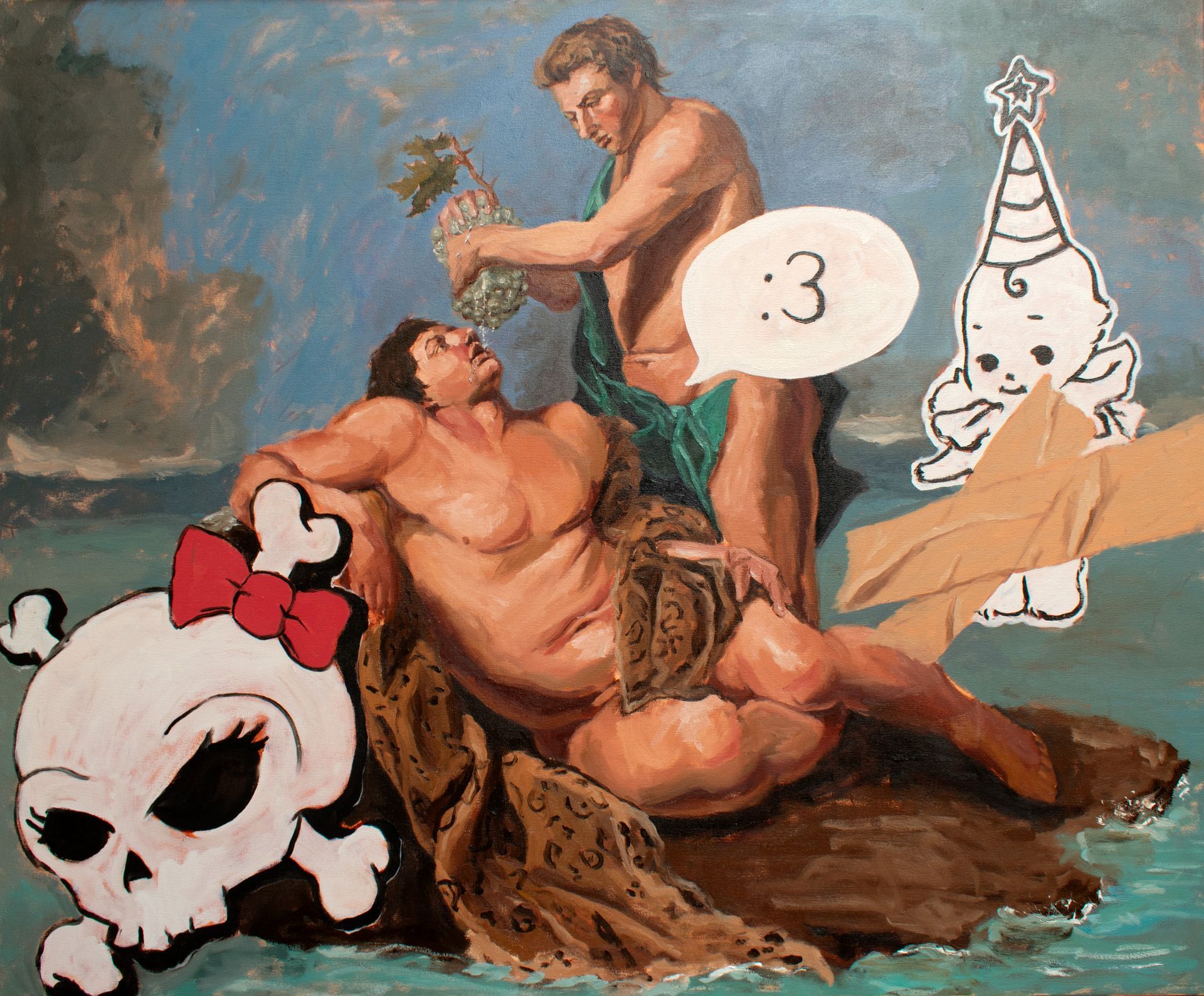 Inspired by the Western painting cannon, chaotic digital media, and my queer identity, I layer classical painting techniques with contemporary symbols to playfully weave queerness into art history. I create references for my paintings by creating collages either digitally or from printed images. These materials allow me to engage in a low-stakes process where I can focus on spontaneity and iteration rather than perfection. By blending art history and my contemporary mindset, I insert queer representation within both historical and contemporary art.